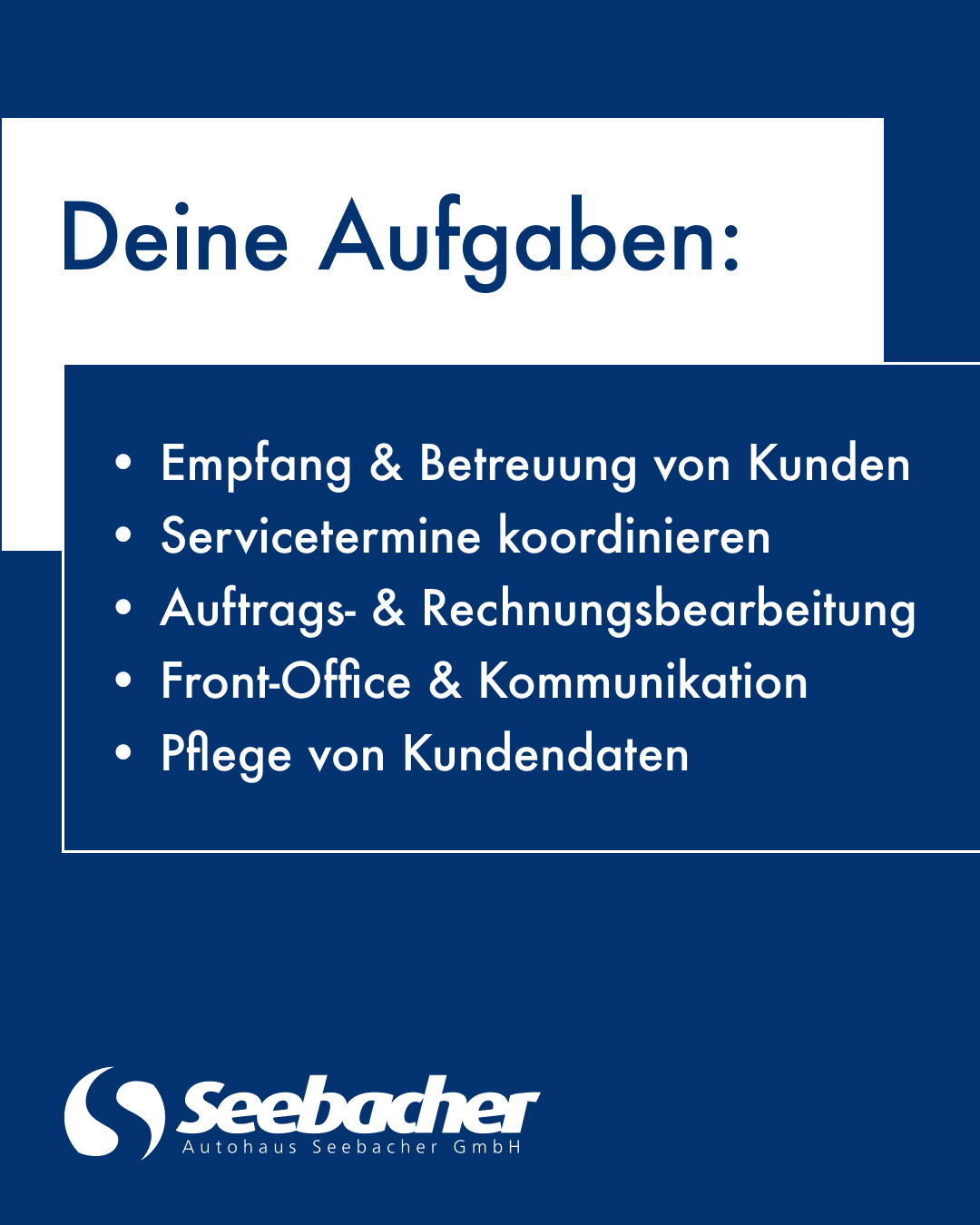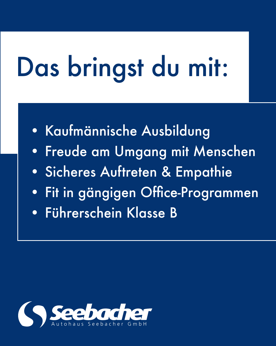 Das Autohaus Seebacher GmbH ist ein familiengeführtes Unternehmen mit langer Tradition und starkem Bezug zur Region. Unser Anspruch ist es, unsere Kundinnen und Kunden mit persönlichem Service, fachlicher Kompetenz und einem motivierten Team nachhaltig zu begeistern.